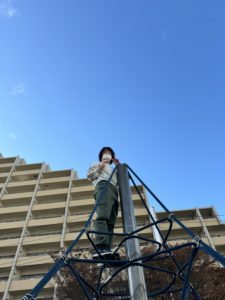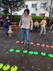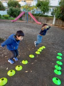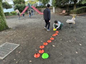 幅跳び(両足で) りぼんU 2024.11.22 こんにちは。 11月21日(木)のりぼんUでは前半は少し離れた公園に行きロープジャングルジム(?)で遊びました。上手にてっぺんまで登ることができました。 後半はマーカーを使って幅跳びジャンプをしました。手をしっかりとふって『せーのっ!』で両足ジャンプ!! マーカーを並べるのと後片付けも中学生のお兄さん達を中心にやってくれました。ありがとう♡ りぼんU