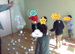 ボール並べ🥎 ワクワク 2024.11.29 こんにちは(*^-^*) 今日は午後ボール並べをしました。 スノーボールを出して開始です!テープの上にスノーボールを並べていきます。 みんなでボールを並べていきました。みんなで協力してテープの上だけにボールがあるようにしていきました。 隙間のない感じで丁寧に並べているお友達。お魚の形が完成しました🐟