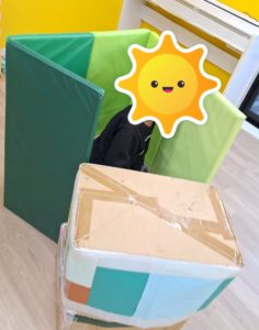 今日の午前中の活動は、かくれんぼをしました。箱、マット、タオルを用意して好きな所に隠れました。ロッカーの中に入り、そこを箱でふさいだり、箱を2重にして中に入り隠れたり、ロッカーと壁の隙間に入ったりなど工夫して隠れていましたよ。