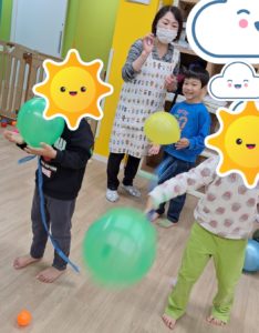 その後は、ボール、風船遊びをしました。大きいボール、小さいボールを投げたり、風船をポンポンと飛ばして体を動かしました。