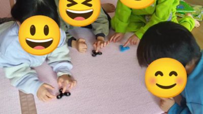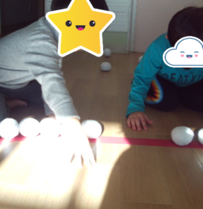はしご渡り ワクワク 2024.12.06 こんにちは。 午後にはしご渡りをしました。はしごを渡って2段の所に来たら、ジャンプして赤の四角にジャンプします。両足で上手に着地出来ました(*^-^*) 円形にテープを貼ってテープの上に立ちました。そしてお隣のお友達と手をつなぎ、輪になりました。なべのなかのくりをして、その後輪っかの上にボールを並べて遊びました。