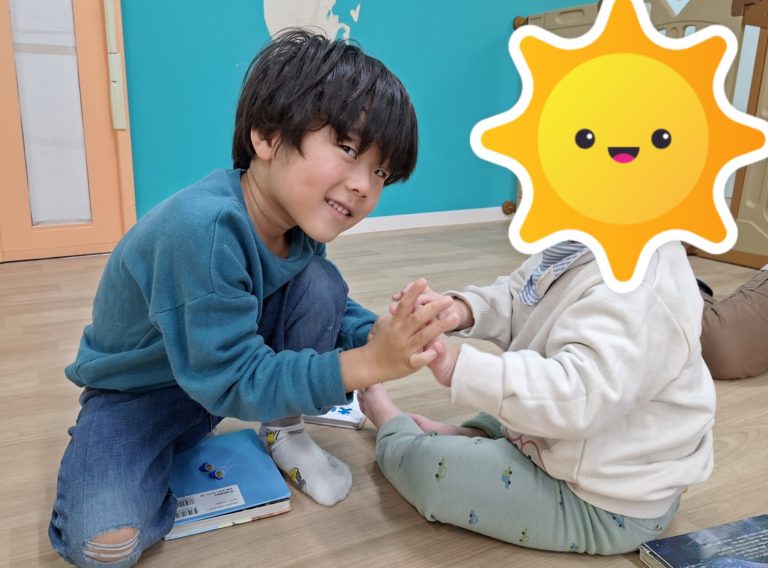 今日の可愛い一コマです☆ 大きいお友だちが小さいお友だちとタッチをしたり、いないいないばあっ!をしたりして遊んであげていました。大きいお友だちは優しい仕草やお顔で話しかけ、小さいお友だちは笑顔で嬉しそうな声を出していて、とても楽しそいに触れ合っていましたよ☆