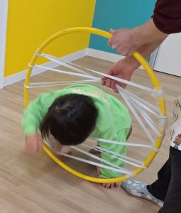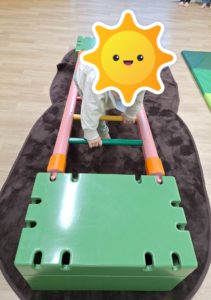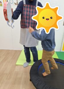 今日の午前中の活動は、サーキットをしました。低い→高いの梯子を渡り、フラフープの中のゴムのトンネルをくぐり、トランポリンを跳んでからタンバリンにタッチをしてジャンプ!