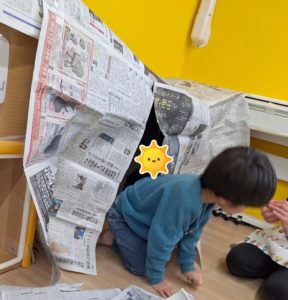 その後は、新聞紙遊びをしました。ハンバーガーを作ってお店屋さんになったり、ホウキを作ってお掃除したり、新聞紙をパンチしてちぎったり、お家を作ってその中で遊んだり。それぞれの活動を楽しんでいましたよ✨✨