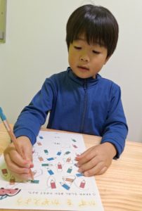 個別でプリントをしました。色鉛筆の数を数えて数字を書きました。