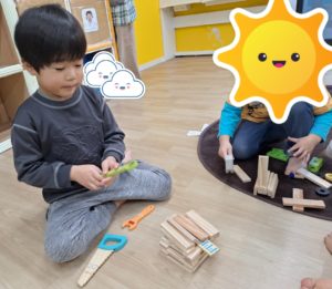 大工さんのキットでお家を作って三匹のこぶたごっこしたり、磁石のコーナーでは車を作って走らせたり、ピザをを作ってご馳走したり。マグネットでは、色々な形のお絵描きをして楽しみました。