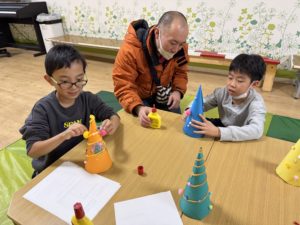 中当て!! りぼんU 2024.12.16 12月16日(月)のりぼんUでは、後半はしじゅうから第2公園に行き、中当てをしました! 縄で丸をつくり、中の人は当てられないようにボールを必死によけました! 当てる人は、相手をよく見て狙っていました! 白熱し、盛り上がりました(^^)/ 前半はお散歩に行きました。天気も良く、気持ちの良いお散歩になりました(^-^) 室内では、クリスマスツリー工作をしました★ ボンドを飾りにつけ、ツリーにペタっと貼り付けました🎄 どんどんクリスマスに近づいており、ウキウキです(*^^*) りぼんU