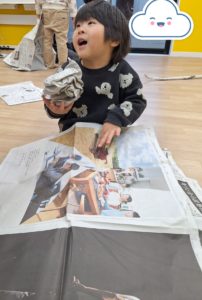 その後は新聞紙をしました。ちぎったり、掃除機やホウキを作ってお掃除したり、おにぎりを作って食べる真似っこをしたり、お布団のように寝てみたりを楽しんでいました。