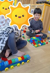 コーナー遊びでは、パズル、積み木、レゴブロック遊びをしました。積み木では、高く積み上げたり、お家をつくったり、ドミノ倒しをして遊びをしました。レゴブロックでは、ピラミットを作ったり、電車を作って走らせたり、動物園を作ったりとイメージを膨らませてごっこ遊びも楽しんでいましたよ。