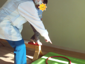 サーキット(平均台~ジャンプ)出来たよ‼ ワクワクoo 2024.12.24 こんにちは 今日は、クリスマスイブ🎄 「サンタさんは、ちゃんと寝ないと来ないんだよ。でも見たいな~」 「プレゼントもらえるよ💓」などなどサンタさんを楽しみにしている お話が沢山聞かれました!(^^)! 今日のサーキットは、平均台をしました 平均台の最後には、プラフープの中に着地します よく見て歩き、ジャンプ! 回を重ねるごとに着地も上手に出来ました♪ oo oo