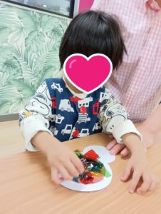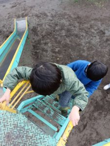 水曜日のりぼん りぼん 2024.12.24 こんにちは! 今日は午前も午後も公園あそびです! じゅんばんこしながら仲良く遊びました! 帰ってからは工作。 色んな色のセロハンが重なってキレイ☆ きらきらの雪だるまができました。 午後も公園へ。 仲良くすべり台☆ 何も言わなくとも譲り合ってます。 西日がきれいだね。 りぼん