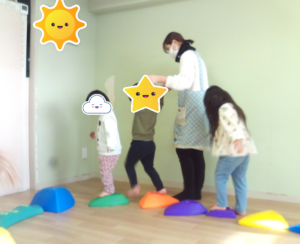 バランスストーン、バランスウェーブ、人工芝、ハードルの運動用具を