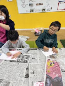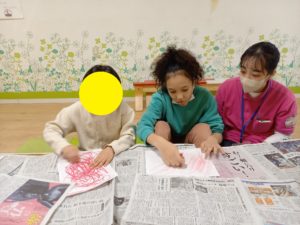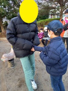 節分工作👹 りぼんU 2025.01.21 こんにちは。 1月20日(月)のりぼんUでは室内では節分工作をしました!裏紙を青や赤のクレヨンで塗りつぶす工程をしました★みんな集中してやってくれました🎵 公園ではバトンリレーをしました★走るというよりは歩いて・・・でもバトンはしっかりとみんなつないでくれました😊 りぼんU