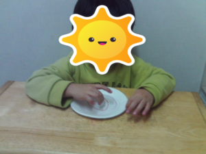 1月製作 こま ワクワク 2025.01.23 こんにちは(*^-^*) 今週から1月の製作が始まっています。 紙皿に丸や好きなものを書き、両面テープでキャップをくっけました。大きいお友達はハサミで両面テープを切るところも行いました。 見本をまねて、紙皿に丸が描けたね~✌ 実際コマを回してみるとクレヨンで書いた丸が回転しきれいでした🍊