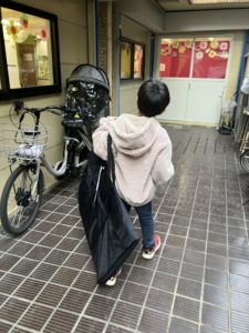 大型絵本と紙芝居を図書館へ借りに行きました。