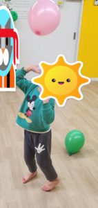 その後は風船遊びをしました。高くあげたり、スタッフが作った腕の輪っかに向かって風船をいれたり、様々な遊びを工夫して楽しみました。