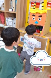 ボール遊びでは、鬼が登場!箱で作った鬼の顔の口の中にたくさんのボールを入れて遊びました。口の中にたくさんのボールが入ると、上から勢い良く降らることも楽しみました☆