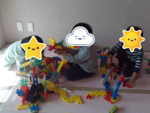 午後のブロック遊びの時間では、様々な形や色のブロックを