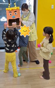 その後は、ボール遊び。鬼のお口にボールをたくさん入れたり、キャッチボールや、サッカーのようにボールを蹴ったりして楽しみました。