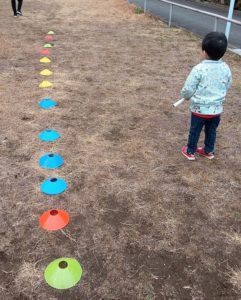 マーカーに沿って走って、まっすぐ走る練習です。