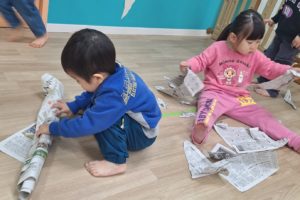 今日は、新聞紙遊びをしました。新聞紙を使って好きなように遊びます。ちぎったり、丸めたり、新聞パンチをしたり。