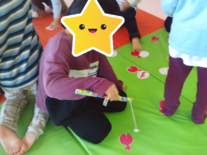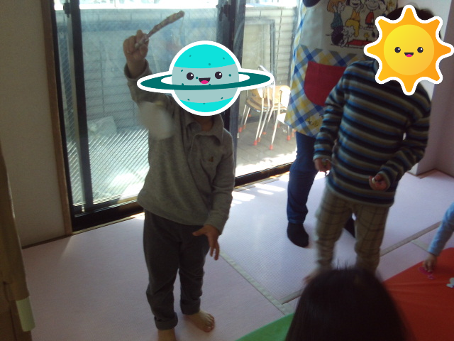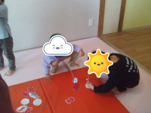 今日は室内遊びで、くだものチームゲームと魚つりをしました。