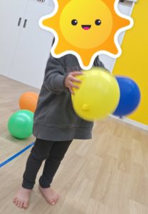 その後に、スタッフがオオカミ役になり、子どもたちと一緒に「もりのこみち さんぽにいこう おおかみなんてこわくないよ おおかみなんてこわくないよ おおかみさん いまなんじ♪」と歌いながら歩きます。8時、昼の12時、「ああよかった」なのですが、夜中の12時になるとオオカミ役は「食べちゃうぞ」と子どもたちを追いかけます。マットのお家に子どもたちは入り食べられずに済みます。歌もやり取りも楽しみながら行いました。