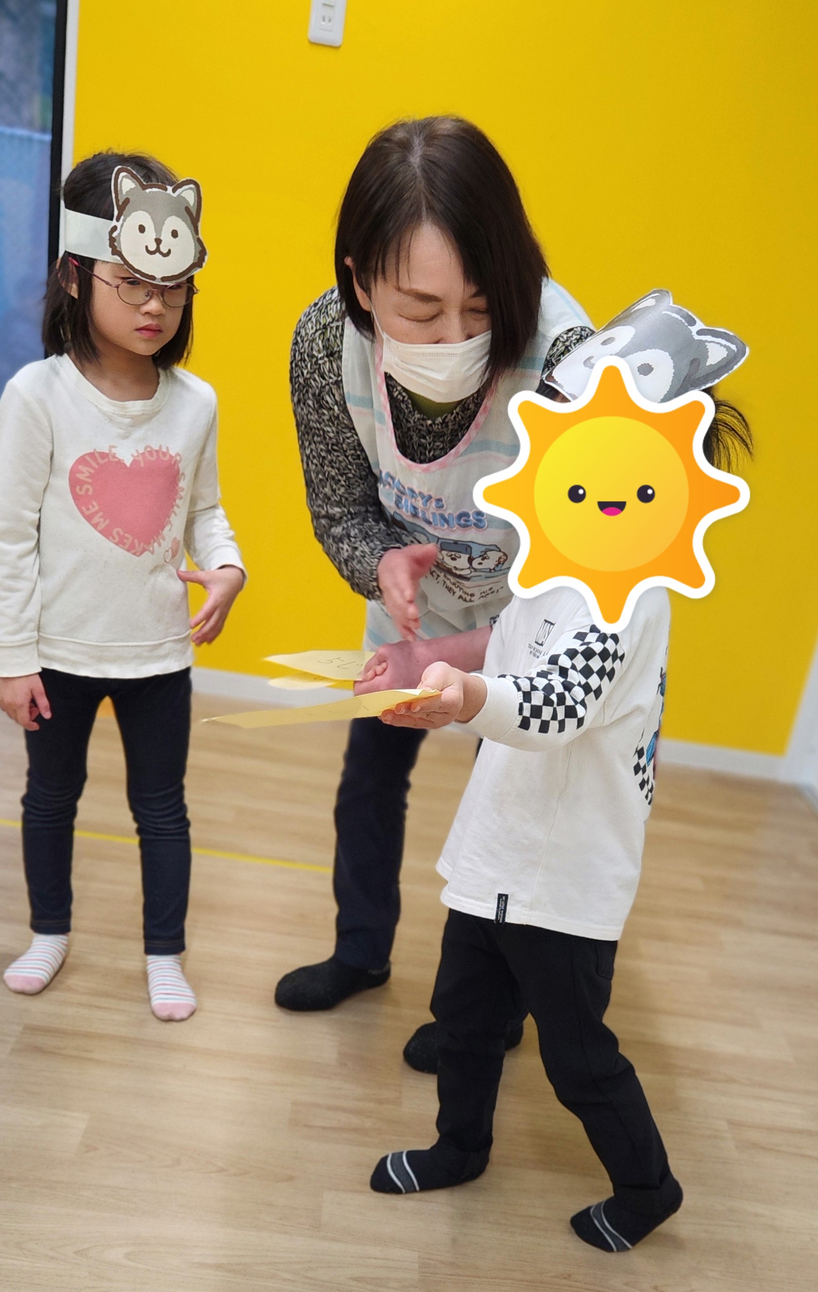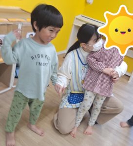 今日も「おおかみさん今何時」をしました。朝の会で「おおかみさんいまなんじ」の絵本を読んでからみんなで「おおかみさん今何時」の設定遊びをしました。はじめにスタッフがオオカミ役になります。歌を歌いながら歩き、夜中の12時になったらオオカミ役がみんなを捕まえます。みんなは逃げてマットのお家に隠れます。2回目からは子どもたちオオカミ役になりました☆ オオカミ役から逃げることも、オオカミ役に捕まることも楽しんでいました。おおかみさんさんが怖いお友だちはマットに隠れることで安心なようでしたよ。