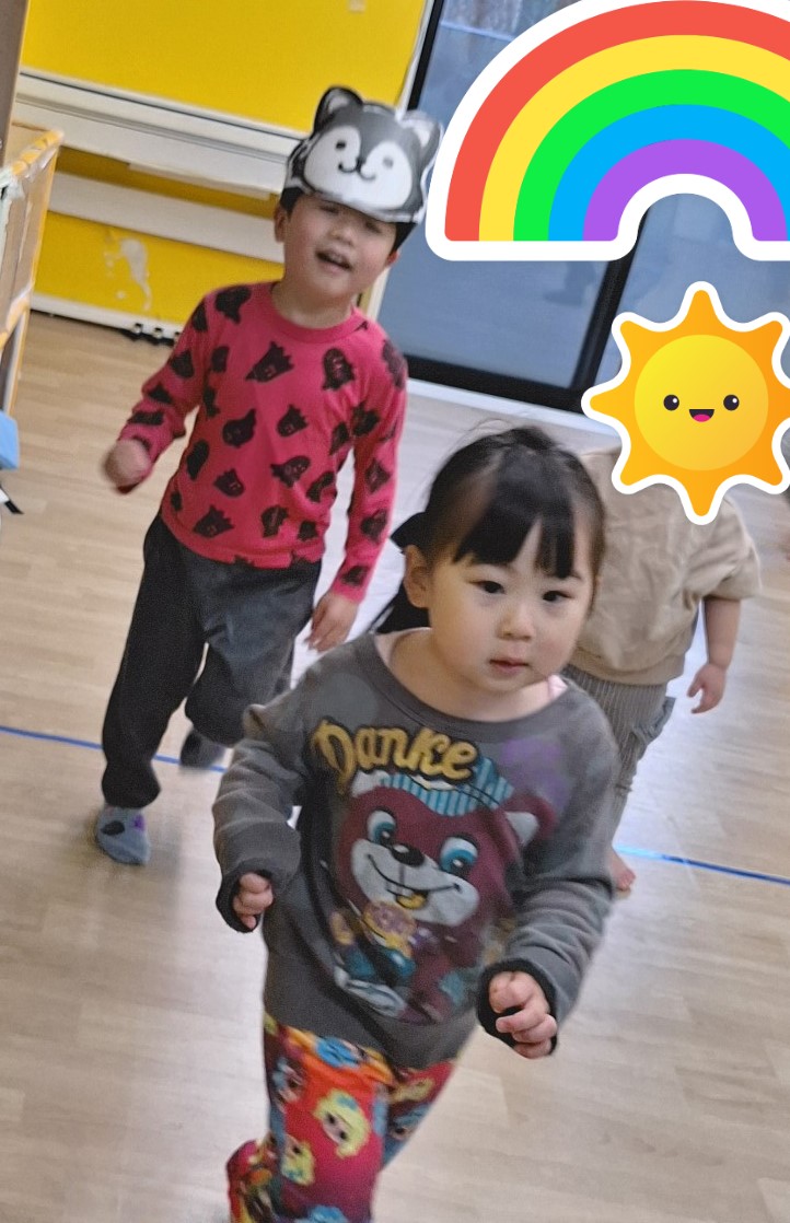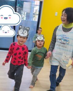 今日も「おおかみさん今何時?」をしました。今日のメンバーは歌が好きなお友だちが多く、みんなで一緒に ♪もりのこみち さんぽにいこう~♪♪ と歌に合わせて歩くことを楽しんでいました。おおかみさんに追いかけられることも楽しいようで、いっぱい走り、マットのお家に逃げていましたよ。