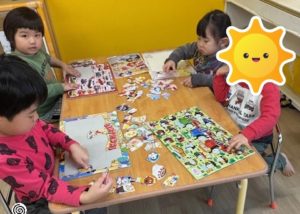 午後は、コーナー遊びをしました。今日は磁石、パズル、お絵描き、スタンプをしました。それぞれの好きな活動に取り組んでいましたよ☆
