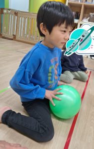 今日は、ころがしキャッチボールをしました。全員で輪になり、真ん中に向いて座ります。ボールを好きな所に転がして、ボールを転がってきたらキャッチし、又転がすことを繰り返していきました。はじめは1個のボールで行い、2個、3個と増やし、最後は5個のボールでころがしキャッチボールを楽しみました。ボールが欲しくて前に出てきてしまう子もいましたが、ルールを守りたくさんボールをキャッチして転がすことができていました。