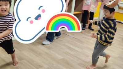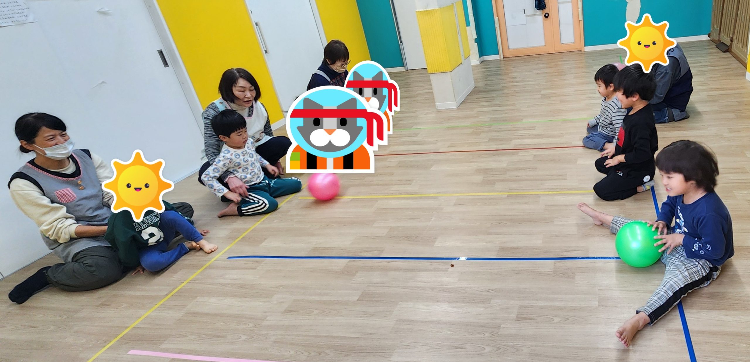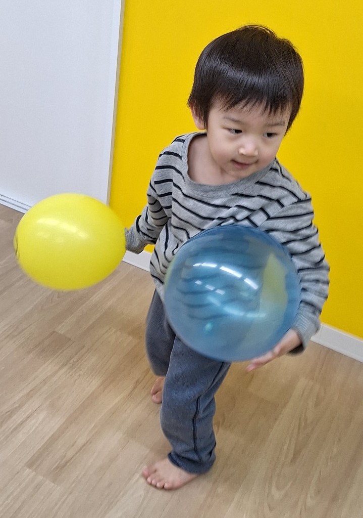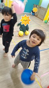 その後は、風船とボール遊びをしました。キャッチボールをしたり、風船を持ってポンポンと追いかけっこをして体を動かしました。