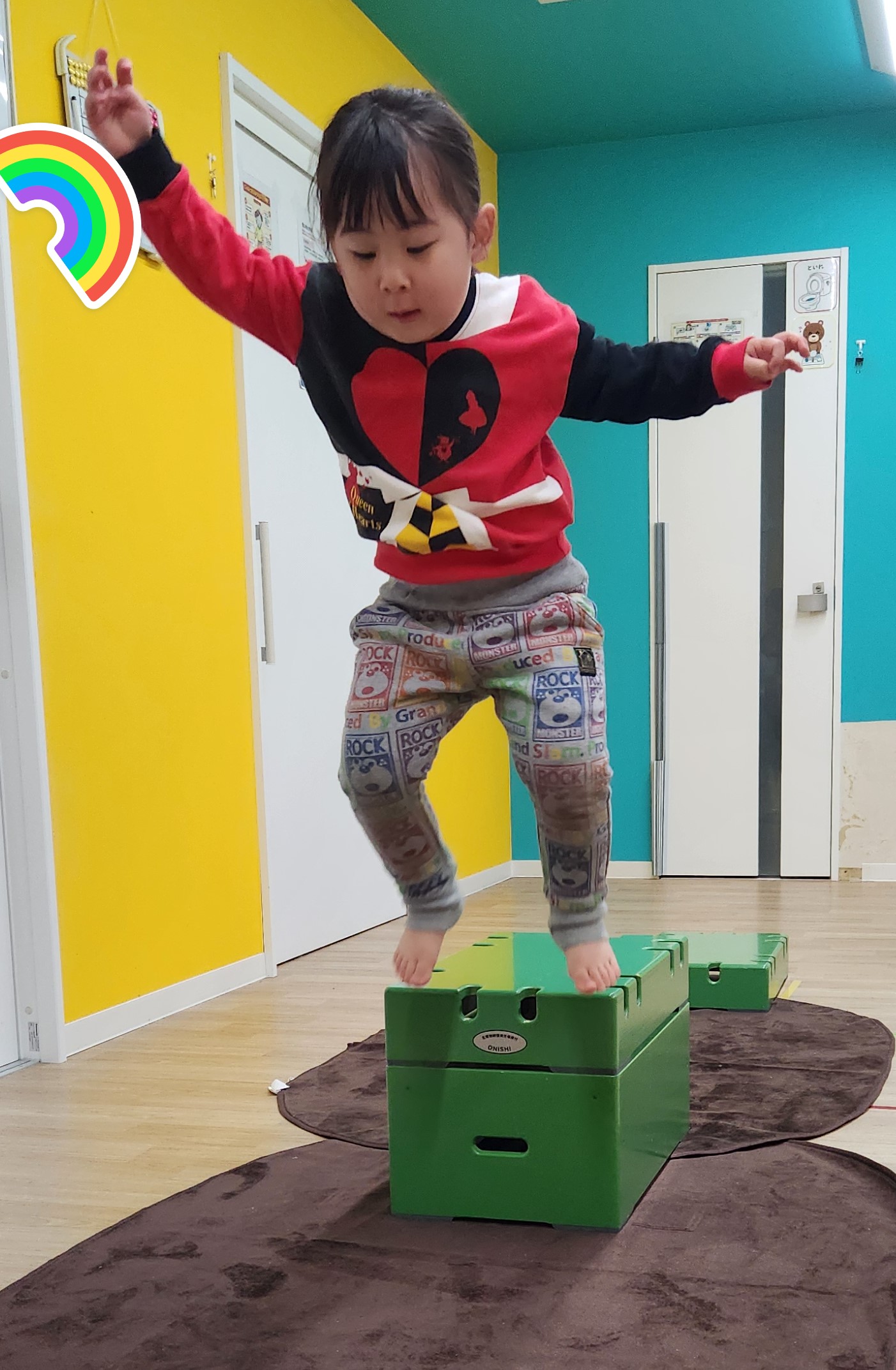今日の活動はサーキットをしました。バランスストーン、トンネル、巧技台両足ジャンプをしました。巧技台両足ジャンプは、低い台と高い台を用意しました。バランスストーンは一人で出来る子、スタッフが手を取り一緒に行う子がいましたが、トンネルとジャンプは一人で行うことが出来ました☆