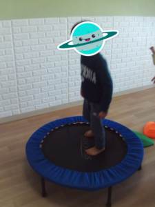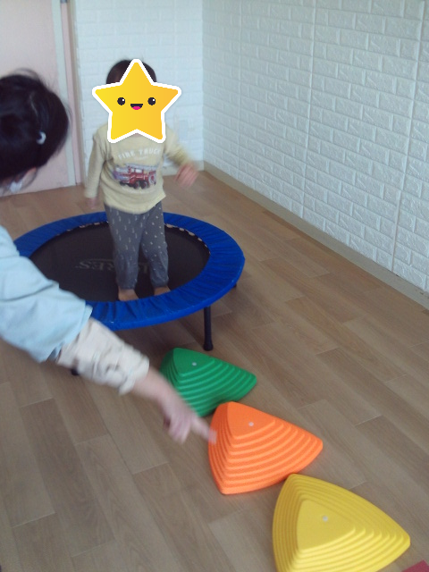 トランポリンで跳ぶ→バランスストーン→赤い線まで行きゴールという