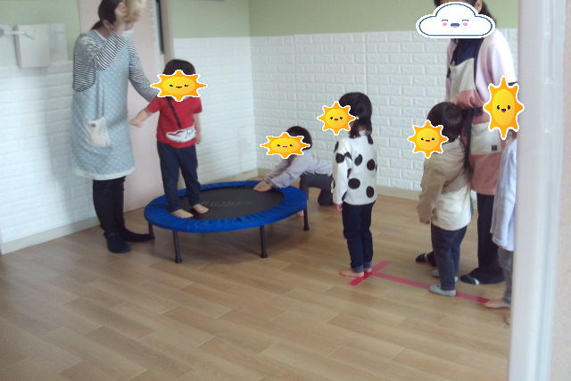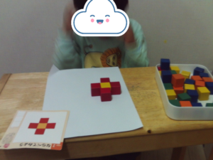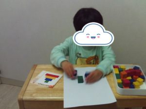 個別の時間 ワクワク 2025.03.27 こんにちは。 個別の時間に図形キューブ積み木をしました。見本のように積み木を並べます。楽しく遊びながら空間認知能力を養います。積み木を見本と同じ数出してから並べる子、下から作っていく子や中心から作っていく子など様々です。簡単な物から始め、難易度の高いものに取り組むお友達もいました。完成するまで集中して行っていました🌸🌸🌸 サーキットはトランポリンです。飛んで職員の持っているタンバリンを鳴らします。楽しそうな声と、タンバリンの音色が別の部屋にいると聞こえてきました(^^♪