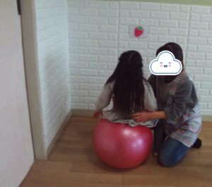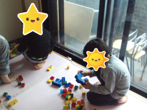 午後にバランスボールやレゴで遊びました。上手にバランスを取って座りながらイチゴも見て視線があげられました。レゴでは貸し借りをしながら遊んだよ。