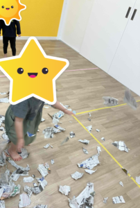 紙吹雪をしたり、寝ころんで泳いでみたり。
