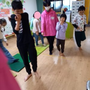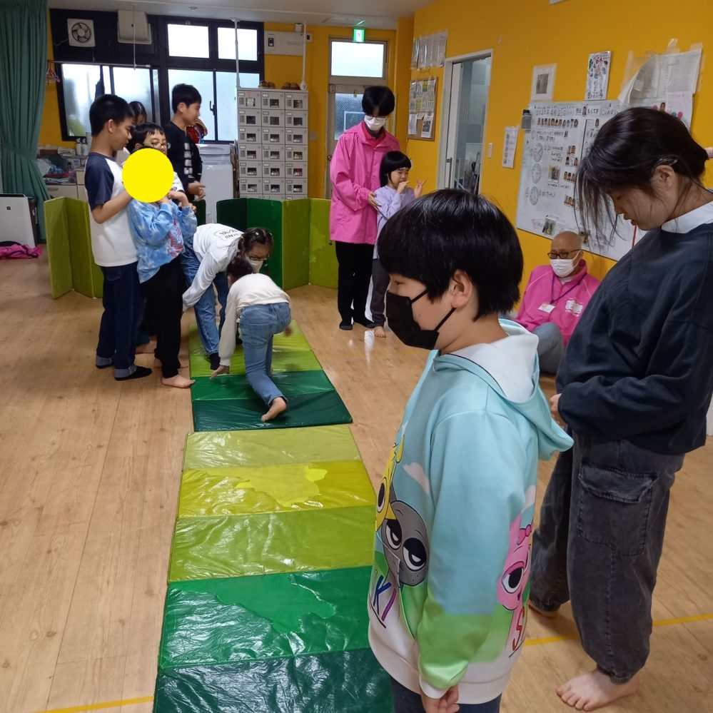 音楽あそび&サーキット りぼんU 2025.04.23 こんにちは。 4月23日(水)のりぼんUでは前半はこいのぼり制作と音楽あそびをしました🎵音楽が鳴っている間は自由に歩いたりダンスしたり、音が止まると動きをストップ!のルールでみんな楽しく参加してくれてとても盛り上がりました✨ 後半は室内でサーキットをしました!平均台を渡ってスタッフとタッチしてからビック巾着でジャンプしながら戻ってくるコースでした。平均台はゆっくりゆっくり渡りタッチは笑顔で😊最後は元気にジャンプ! りぼんU