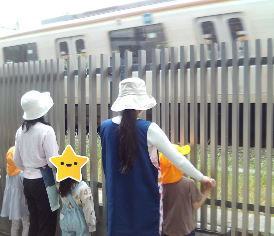 歩いている途中電車がよく見える場所でみんなで止まり、