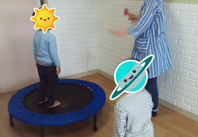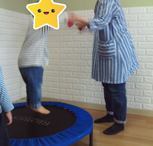 何度も列に並びなおしてたくさんトランポリンに挑戦する積極的な姿も