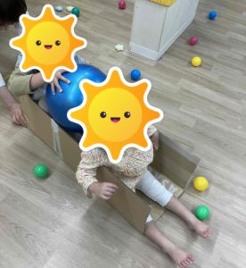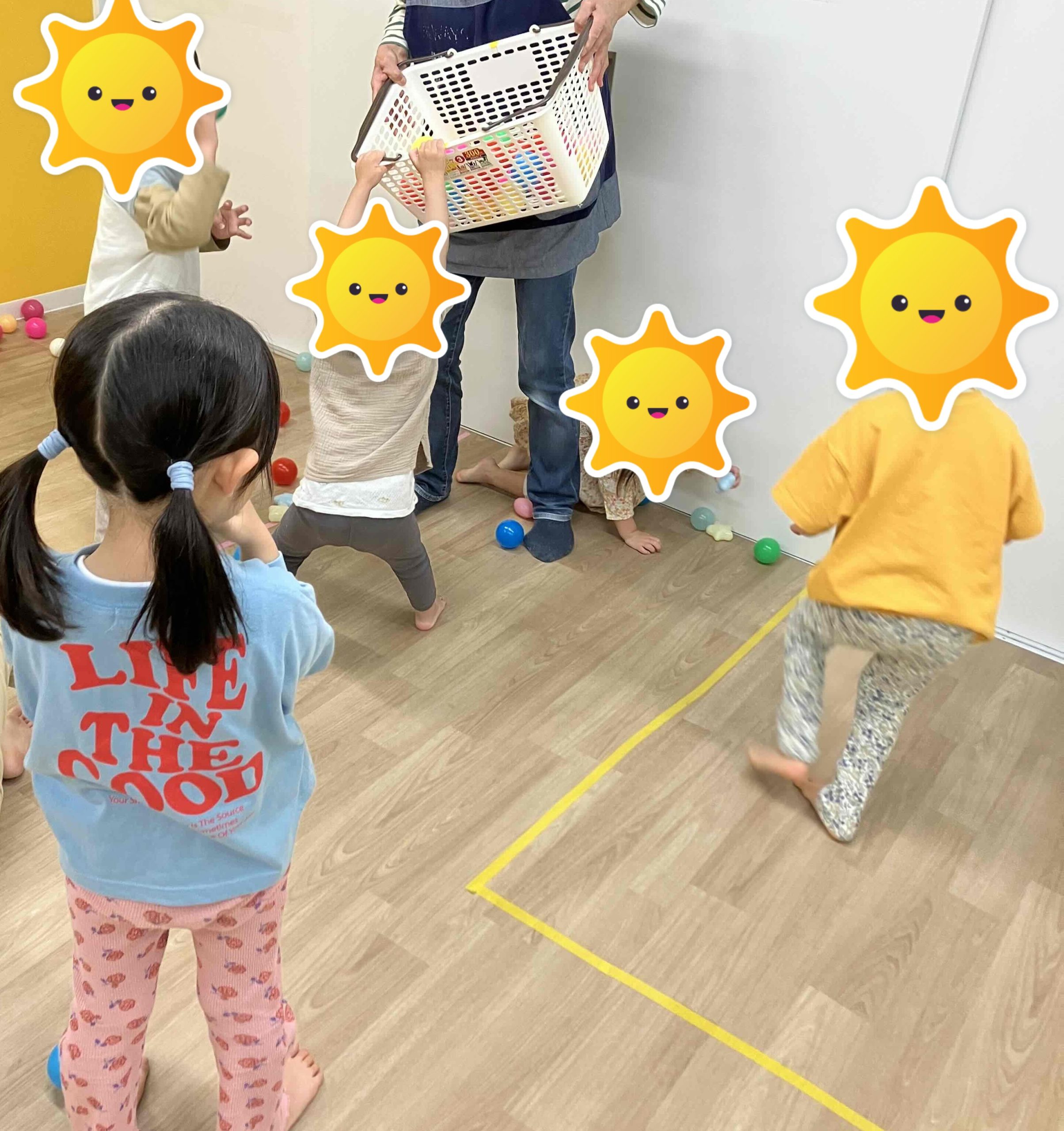 今日の午前中の活動は「追いかけ玉入れ」をしました。スタッフがカゴを後ろ手に持って走り、子どもたちがカゴを持ったスタッフうを追いかけ、ボールをカゴに投げ入れます。子どもたちはボールを拾って走り、ボールをカゴに入れる動作を繰り返します。たくさんのボールをカゴに入れることが出来ましたよ。