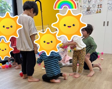 透明の傘を使い、ボールの様子が見えることで小さいお友だちも下からのぞいたり、大きいお友だちの真似をして入れたりする姿がみられました✨傘からボールを取り出すのも楽しかったようです!