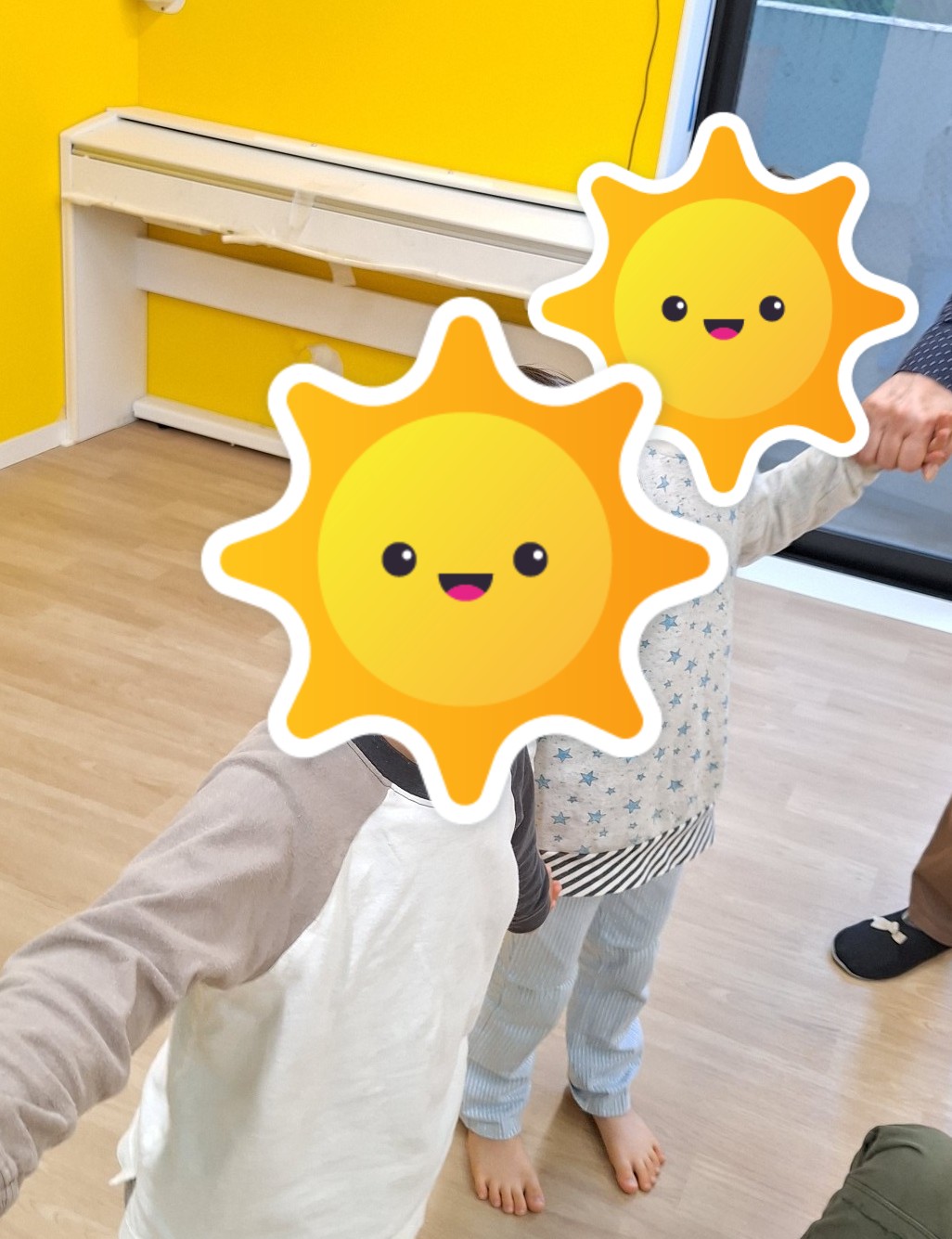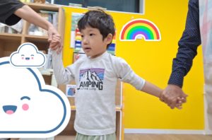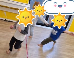 みんなで手をつないで輪になり、くま役のまわりをむっくりくまさんの歌を歌いながら回ります。「くまさん、起きて!」でくま役が起きて子どもたちを追いかけました。くま役はスタッフだけでなく、子どもたちも「くまさんやりたい!」自ら立候補して行っていましたよ♪