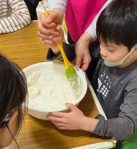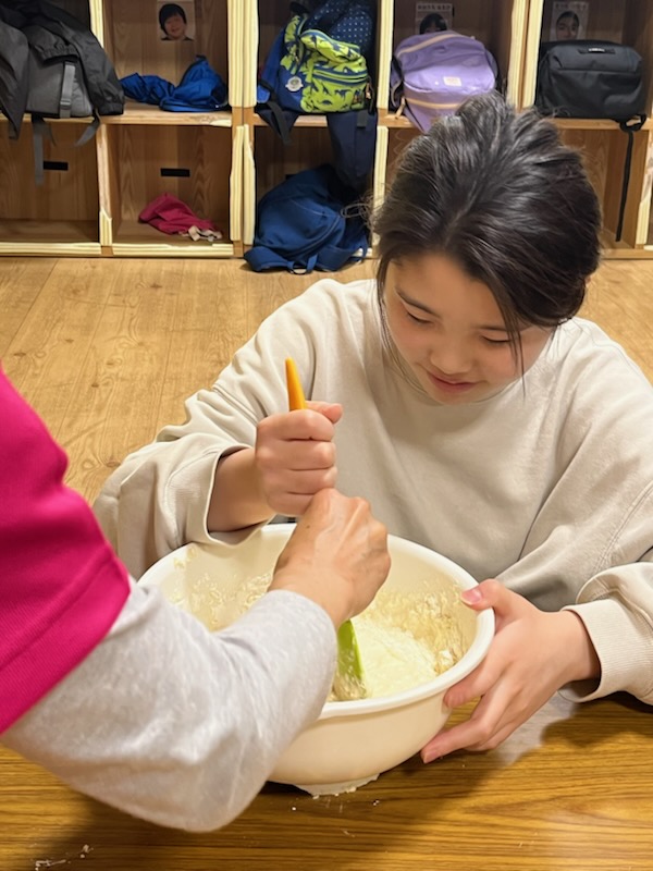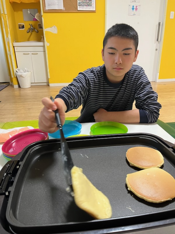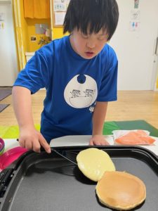 調理では、楽しくホットケーキミックスを混ぜ混ぜ🎵 できる子は卵割り🥚にも挑戦していましたよ!