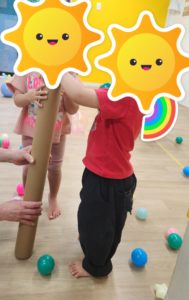 その後はボール遊びをしました。大きなボールに座ったり乗ったりしたり、筒の中にボールを入れて転がして遊んだりして体を動かしました。