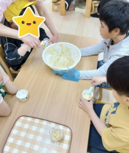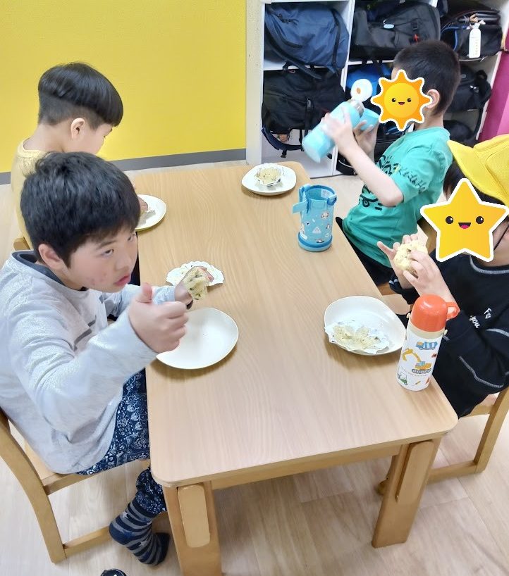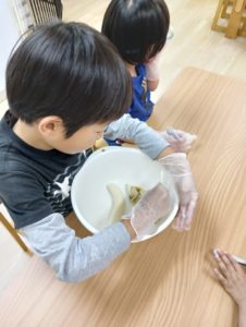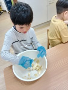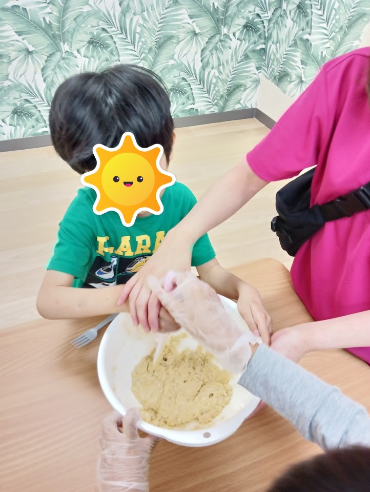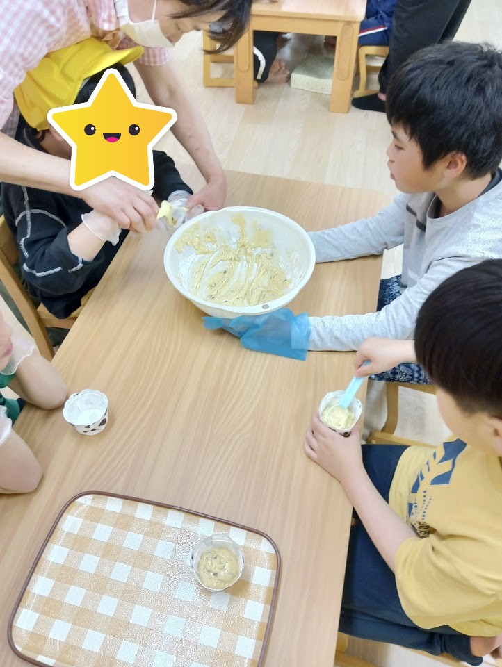 カップケーキ作り りぼん 2025.05.13 こんにちは! 5/8 木曜日のりぼんはみんなでおやつ作り! チョコバナナカップケーキを作りました🍌 バナナをつぶして… 卵とホットケーキミックス、チョコチップをまぜまぜ… 生地をカップに入れたら電子レンジでチン! とってもおいしくできました(*^-^*) りぼん