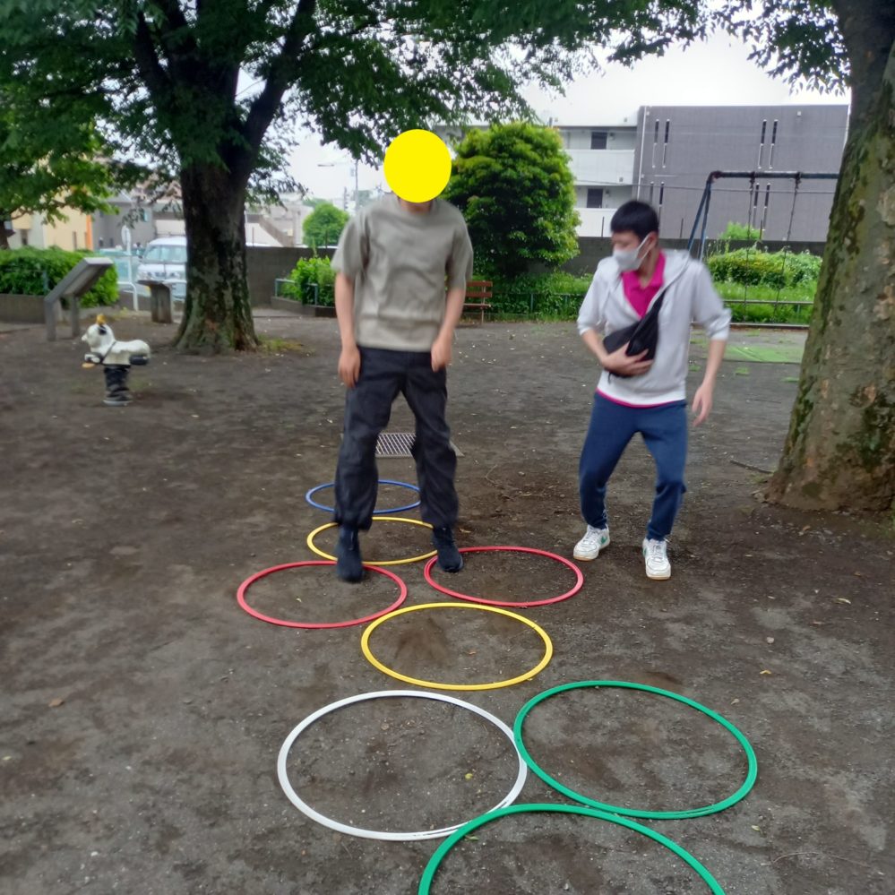 けんけんぱ! りぼんU 2025.05.13 こんにちは。 5月12日(月)のりぼんUでは室内で音楽に合わせて楽器を鳴らしたり、体を動かしたりして楽しく過ごしました🎵 公園ではフープを使ってけんけんぱ!をしました。片足で難しいお友達は両足でけんけんぱ!を頑張ってくれました(⌒∇⌒) りぼんU
