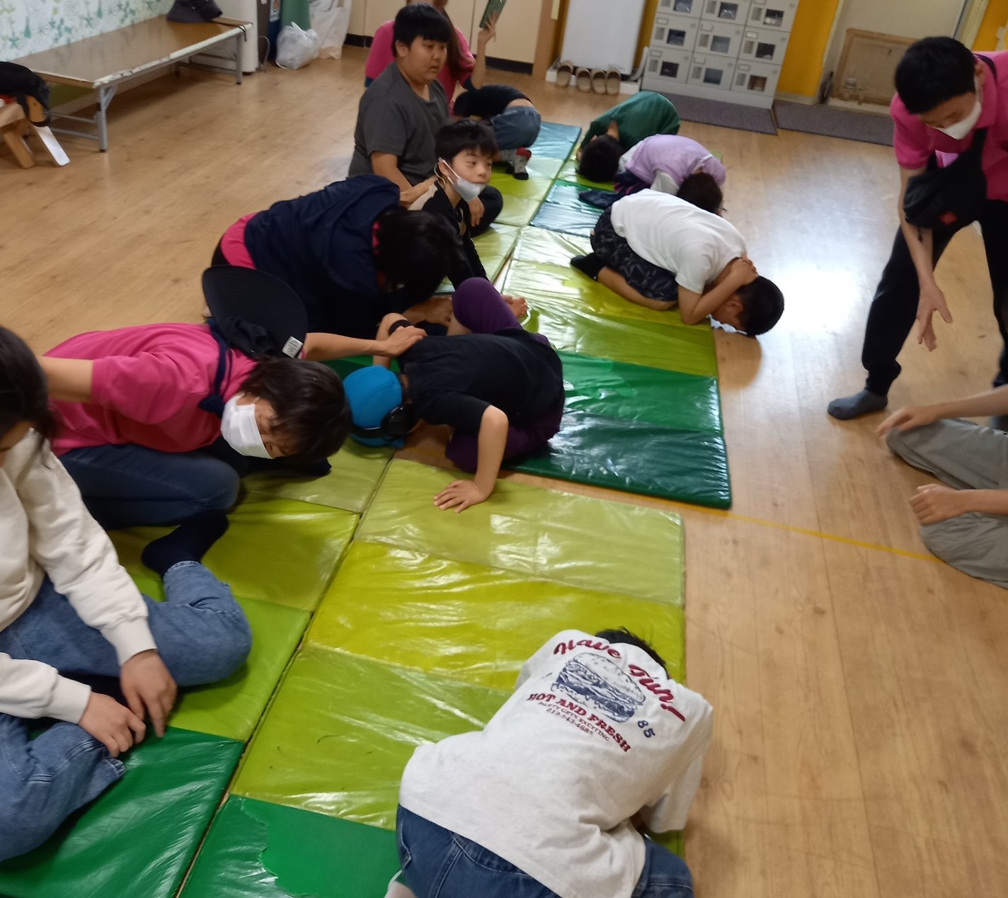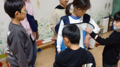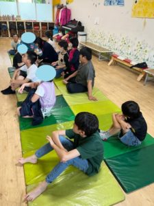 緊急アラートの音を一緒に聞いたり、頭を守るポーズ(だんごむしのポーズ)、ヘルメットの着用など、みんなしっかりと身についており、上手にできていました✨