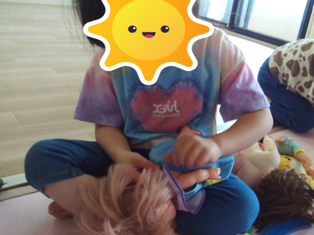「お人形出して。」と希望したお友達。レゴで作ったミルクを飲ませてあげたり、洋服を着せてあげたりお世話をしていました。オーバーオールは足からはかせて、前開きのシャツは手から着せてあげていました。それを見ていた年下のお友達も真似て脱がそうとしたりしていました。遊びを通して衣類の着脱の習得に繋がるといいなあと思います(*^-^*)