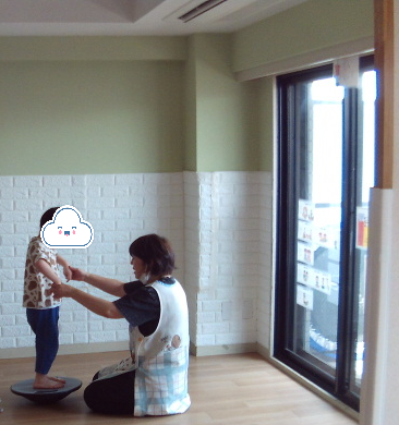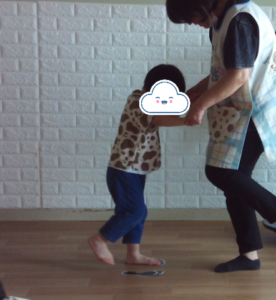 サーキットでは片足立ちと、バランスボードをしました。職員が足を上げると真似して片足を上げます。職員と手を繋ぎバランスを取っています。